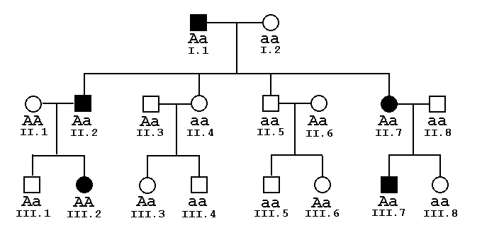 Figure 8.5. An example of linkage between a marker locus with alleles A and a and a dominant disorder with alleles D (which causes the disorder) and d (the normal allele). The grandfather is haplotype AD/ad and the grandmother is haplotype ad/ad.