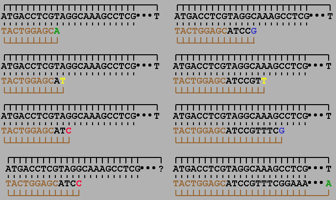 Figure 7.A.4. Dideoxy sequencing. Step 4: Wait for a while. With many copies of the single-stranded DNA and primer hybrids in the mixture, there will be many copies of the newly synthesized strand. However, the length of the synthesized strands will differ because of the chance incorporation of the chain-terminating dideoxy nucleotides. Some examples are shown in the figure below.