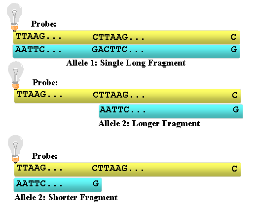 Figure 7.3e. Steps in RFLP genotyping. The DNA within the gel is actually invisible, so the next step is to bathe the gel in a large amount of probe. The probe will bind to the alleles and "light" them up so that they are now visible. (Some technical steps have been omitted here).