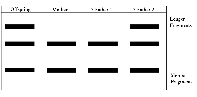 Figure 7.3g. Steps in RFLP genotyping. Usually, DNA from several individuals is placed into different lanes of the same gel. The following figure shows hypothetical results from a paternity test using the RFLP polymorphism developed from this example. The offspring is a heterozytoge--she has one copy of Allele 1 (the single band closest to the start lane) and one copy of Allele 2 (the two bands that have migrated farther onto the gel). The mother is a homozygote for Allele 2. The genotypes of the two putative fathers are depicted in the rightmost lanes. What would you conclude from these data?