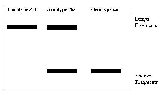 Figure 7.4b. Examples of how the the three genotypes of previous tetranucleotide polymorphism would look. Allele A, having eight repeats, would not migrate as far on the gel as the shorter allele a with only four repeats.