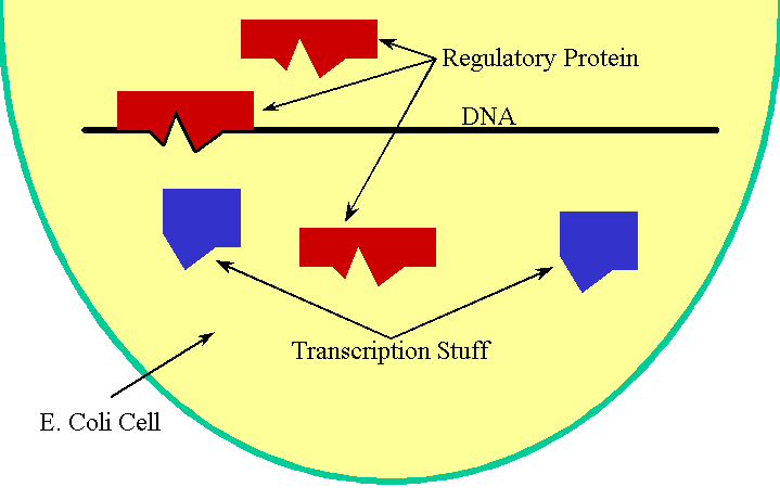 Figure 4.1 (a). The Lac operon in bacteria when the system is turned off. A regulatory protein (red figure) binds to the DNA close to a promoter region (a section of DNA where transcription enzymes bind to intitate the process of transcription). The presence of the regulatory protein prevents the transcription enzymes from binding with the DNA. Hence, the proteins coded for by the genes downstream from this area are not made.