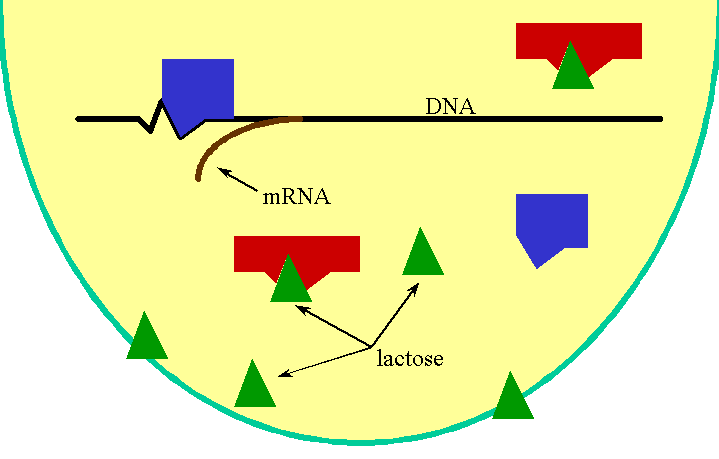 Figure 4.1 (b). The Lac operon in bacteria when the system is turned on. When lactose molecules (green triangles) are present, they bind with the regulatory proteins. This changes the the physical shape of lactose-regulatory protein molecule and prevents it from binding with the DNA. (Note how the red-green complexes no longer have the appropriate shape to fit into the promoter region. The transcription enzymes are now free to bind to the promoter DNA sequence initiating the transctiption of messenger RNA. The mRNA transcripts are translated into enzymes that metabolize the lactose. Once all the lactose has been metabolized, the regulatory proteins bind to the DNA, prevent further transcription, and the system is shut off.